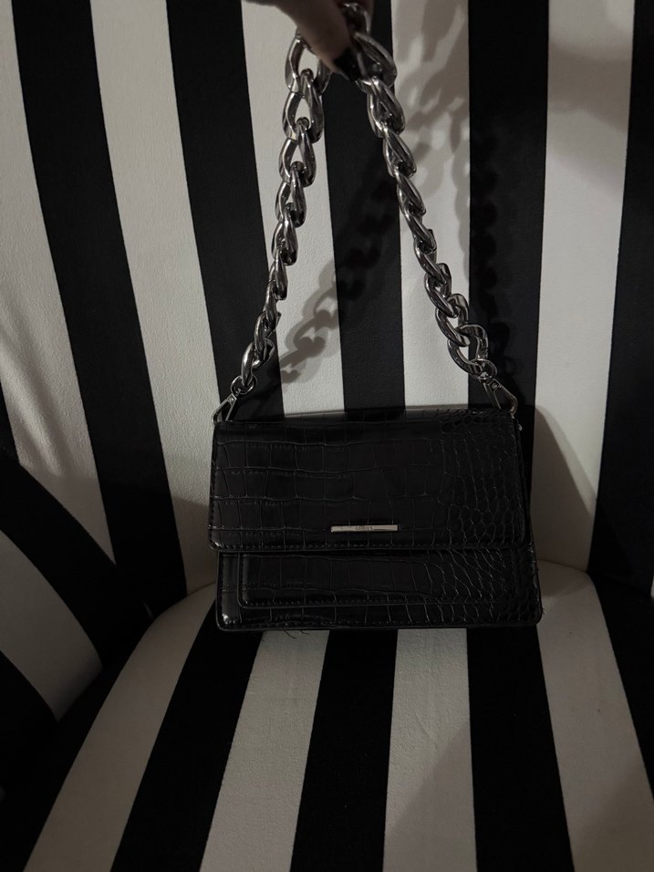 Zincir detaylı siyah deri kadın çanta, koyu zebra desenli. Günlük kullanıma uygun, trend sokak stili için ideal.