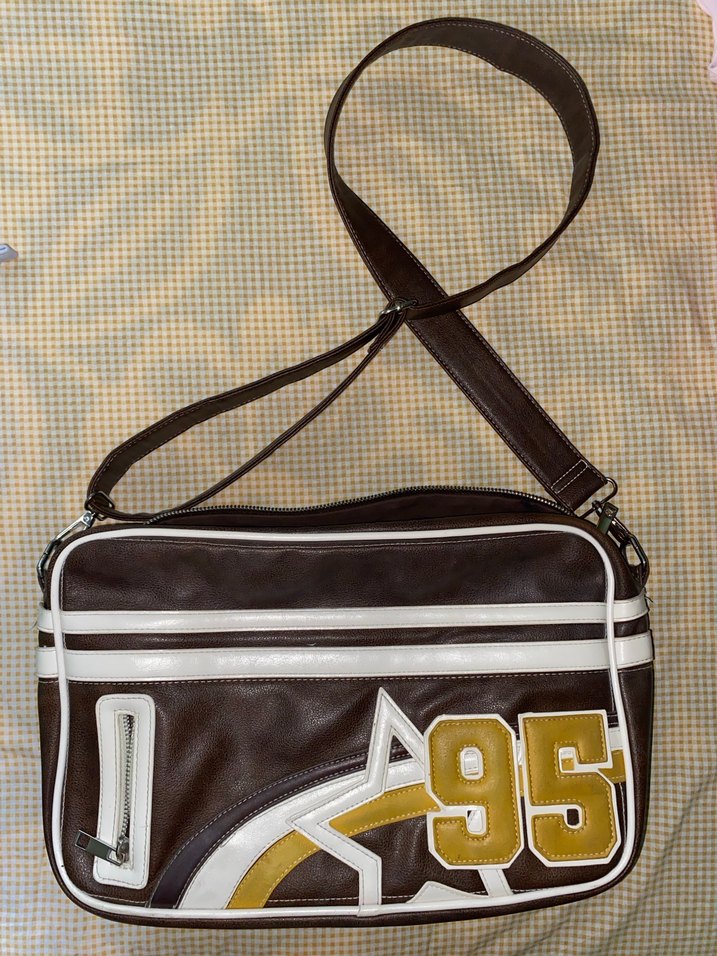 Kahverengi baskılı erkek omuz çantası, 95 numara detayı, fermuarlı ana bölme ve ayarlanabilir askıya sahip. Trendy sokak stili için uygun.