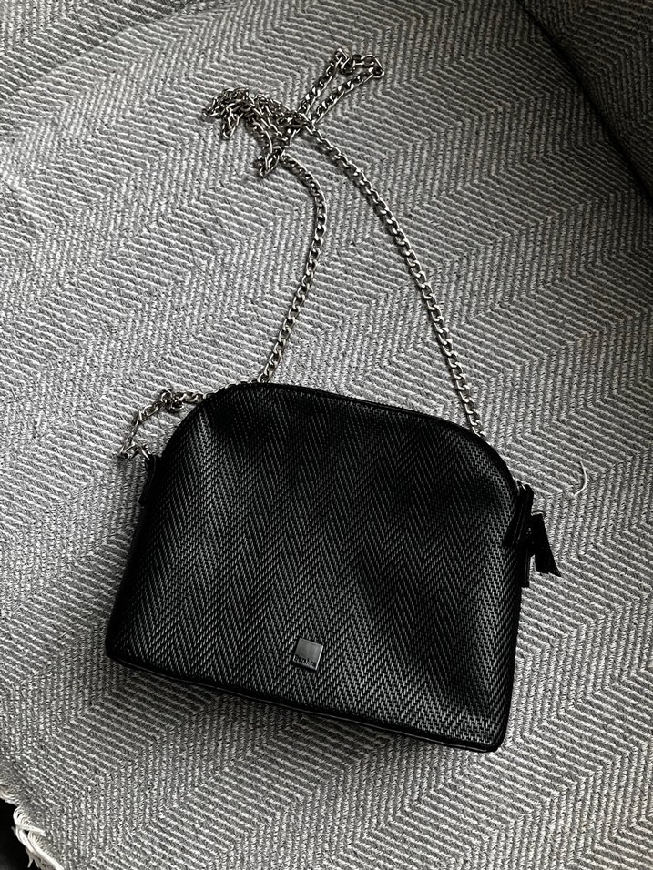Siyah deri yılan desenli kadın çanta, fermuarlı ve zincir askılı, sokak stiline uygun.