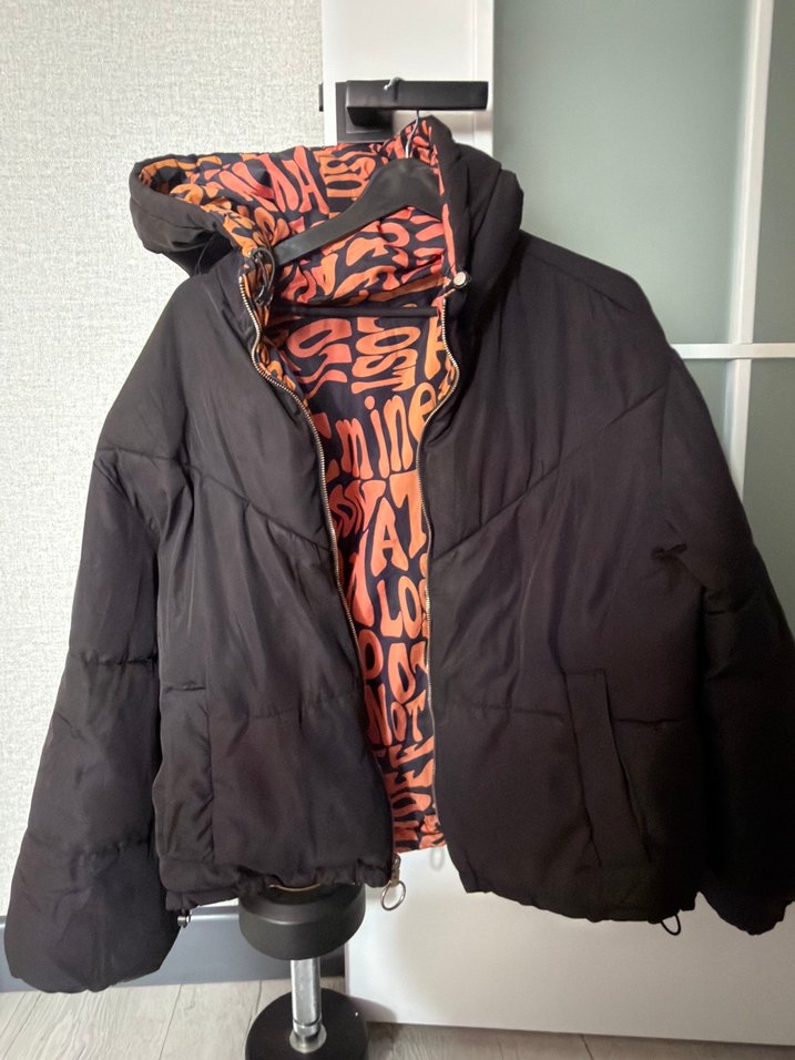Siyah, bol kesim, yüksek yakalı ve fermuarlı kadın kışlık mont. Askılı kollu ve baskılı iç astarlı, günlük kullanıma uygun sokak stili mont. çift taraflı
