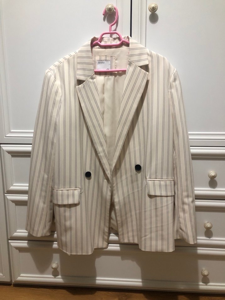 Bershka-Çizgili Beyaz Kadın Blazer Ceket