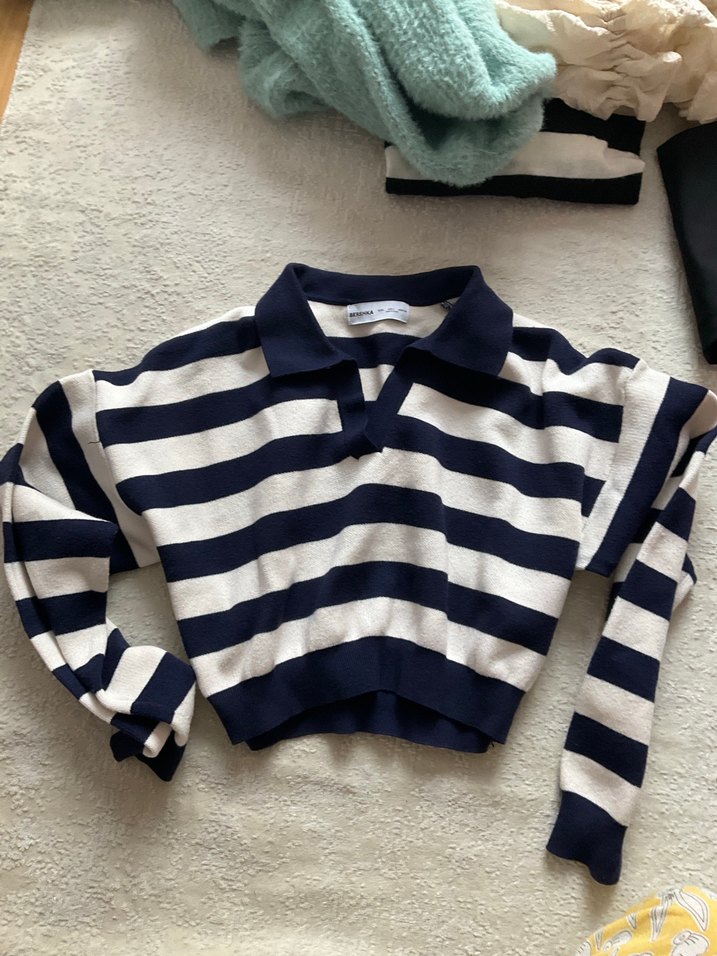 Uzun kollu, yakalı triko kadın kazak, yumuşak örme kumaştan üretilmiş. Gevşek kesimi ve koyu-beyaz çizgileriyle günlük kullanıma uygun, Paris sokak stilini yansıtıyor.