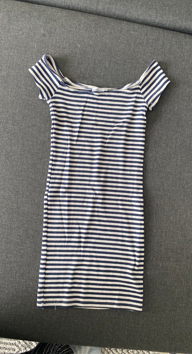Kayık yakalı, kısa kollu, çizgili midi elbise. Gri ve beyaz renklerde, yumuşak sentetik kumaştan. Minimalist ve rahat sokak stiline uygun, şık ve trend bir seçim.