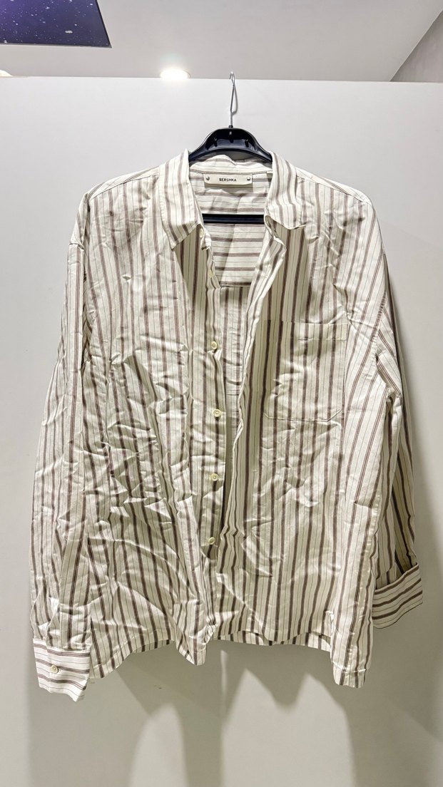 Bershka erkek XL beden gömlek, 80cm uzunluk, sayılı giyildi hiçbir defosu yoktur. Beyaz renkli pamuk kumaştan, kahverengi çizgili, düğmeli ve uzun kollu, notched lapel yakalı bol kesim gömlek. Rahat günlük stil için uygundur.
