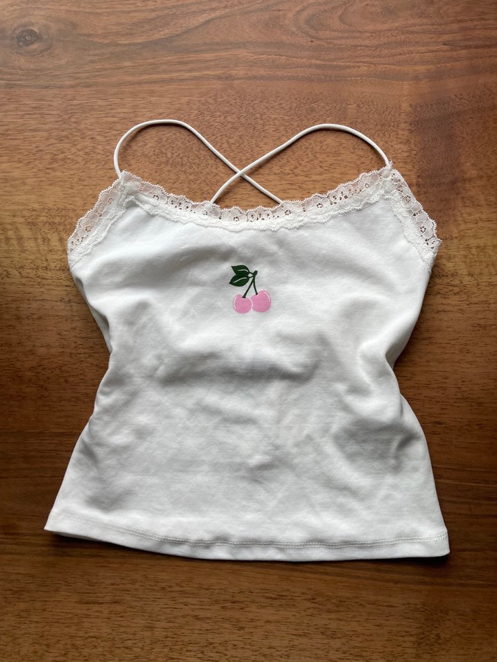 Pamuklu, askısız, dantel detaylı beyaz atlet. Ön kısmında nakışlı kiraz motifi bulunur. Minimalist ve sokak tarzı için uygundur.