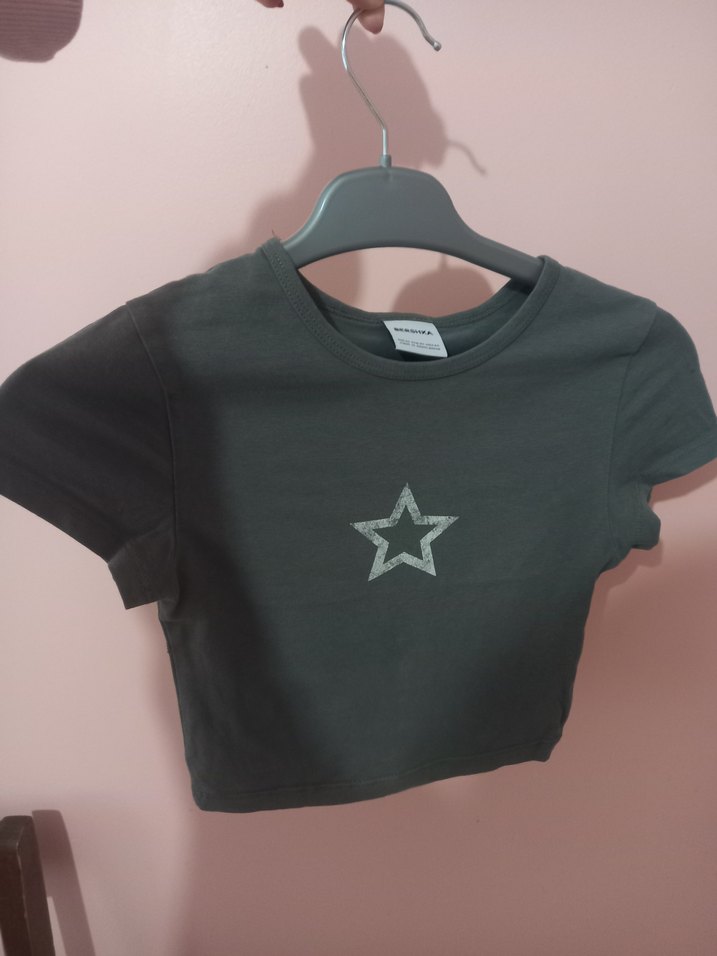 Gri renkli, kısa boy ve fitted kesim tişört, yuvarlak yaka ve baskılı yıldız deseni içerir. Sorununu ekledim giyildiğinde çok belli olmuyor