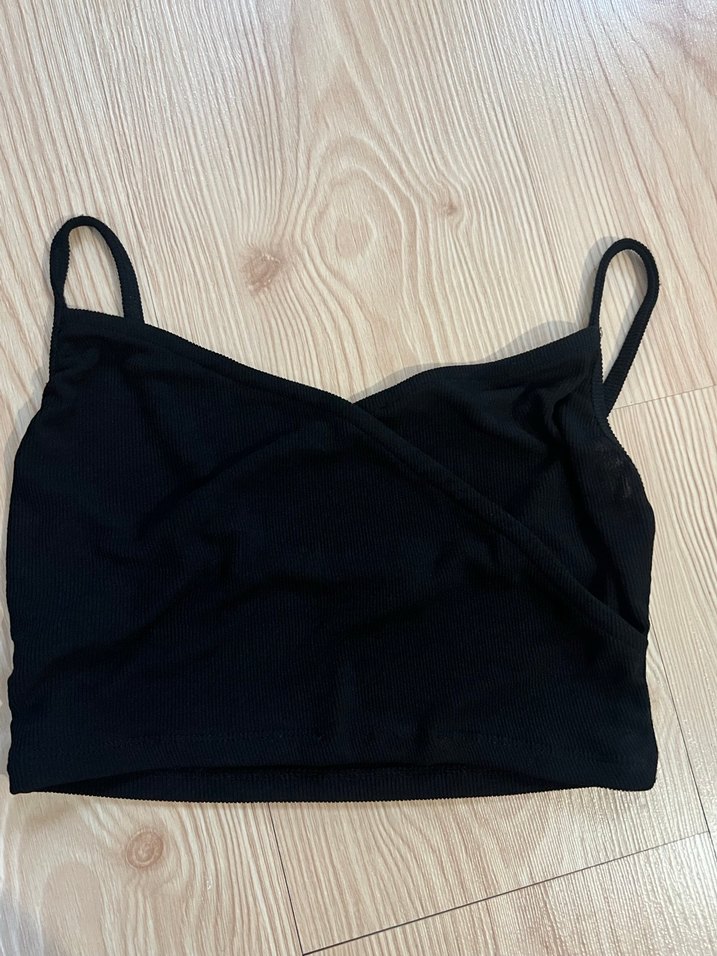 İnce askılı, siyah, desen içermeyen gece tarzına uygun crop. Asimetrik çapraz dekolte.