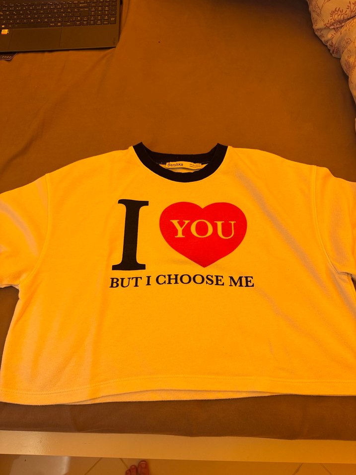 Bershka kısa kollu pamuklu, salaş kesim ve yuvarlak yakalı tişört. Üzerinde "I ❤️ YOU BUT I CHOOSE ME" renkli baskı bulunur, rahat ve şık bir tarz sunar.