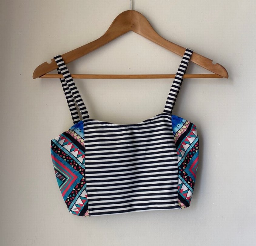 Çizgili ve geometrik desenli renkli baskıya sahip, askılı ve dar kesim kadın crop top, bohem tarz için uygun.