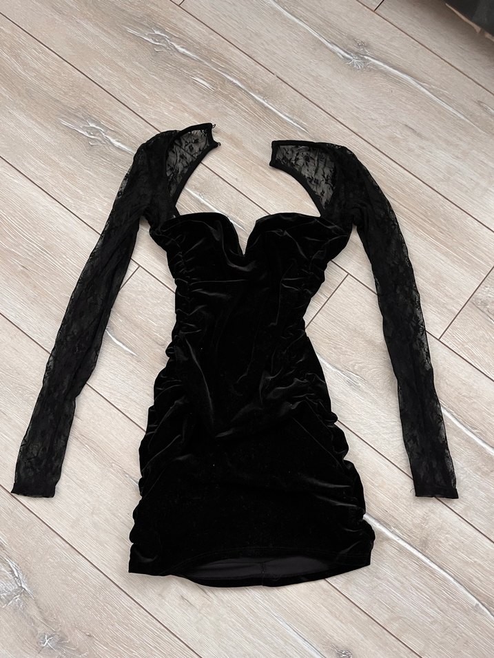 Bu siyah mini elbise, V yakalı ve uzun dantel kollu, vücuda oturan kesimiyle cesur romantik akşamlar için uygun. Yumuşak dokulu, desensiz tasarım. Kadife kumaştan yapılmış sırt dekoltesi var. Çok güzel bir ürün. Göğüs tellerinden biri hafif çıkmış ama mağazadan aldığımda da öyleydi kolay yapılabilir sanırım fotolarda belirttim. 1 kere özel günde giydim.