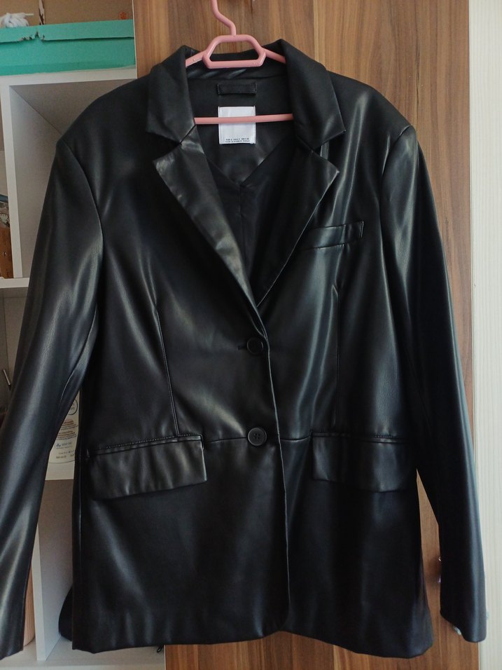 Bir iki kere giydim. Düğmeli, siyah deri ceket, klasik yaka ve normal uzunlukta. Uzun kollu ve rahat kesim.