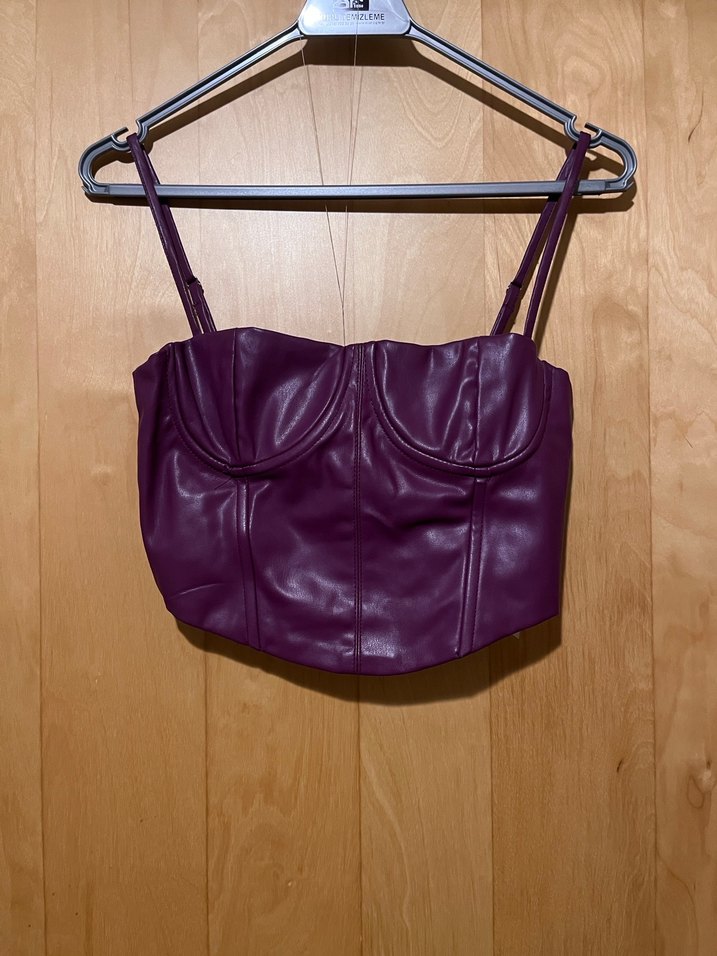 Mor deri kumaştan, askılı vücuda oturan kadın büstiyer, hiç giyilmedi yeni sorunu yok.