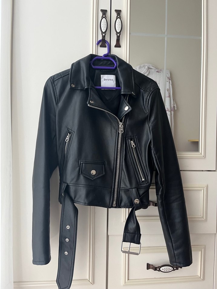 Siyah, dar kesim deri biker ceket. Kesik yaka, askılı kollar ve kemerli bel ile midi uzunlukta, desen yok. Rahat kullanım için uygundur.