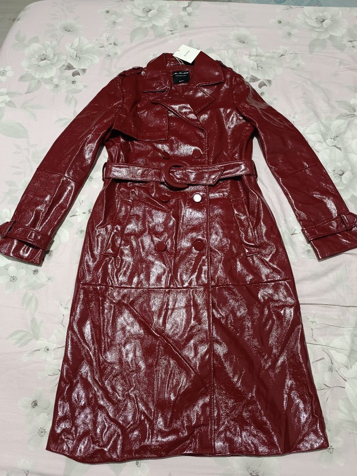 Parlak bordo deri, kemerli ve uzun kesim kadın trençkot. Notch yaka ve askılı kollarıyla sokak modasına uygun şık tasarım. M-L beden yeni ve etiketli.
