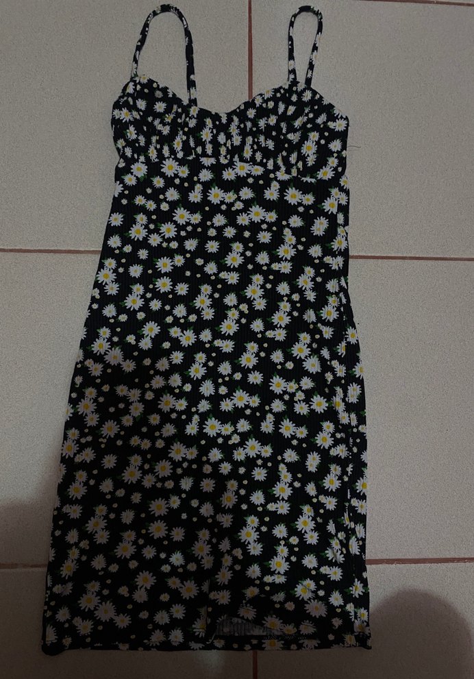 İnce askılı ve , siyah zemin üzerine beyaz papatya desenli, vücuda oturan mini elbise. Günlük kullanıma uygun, bohem tarzda.
