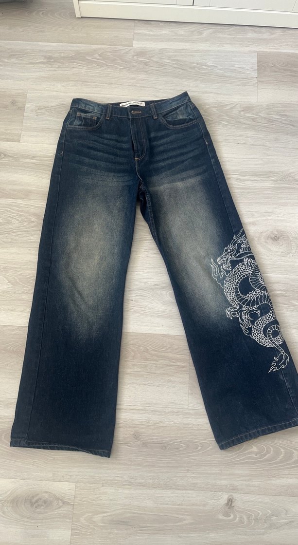 Kadınlar için lacivert denimden yapılmış, yılan desenli ve payet detaylı geniş paça jean. Midi boy ve koyu renk tonuna sahip, rahat sokak stili için uygun.
