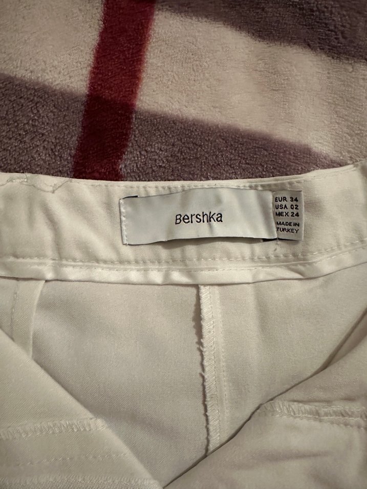 Bershka markalı, düğmeli ve beyaz kumaş pantolon. Günlük kullanıma uygun, düz ve sade tarzda, hafif desenli kumaş pantolon.