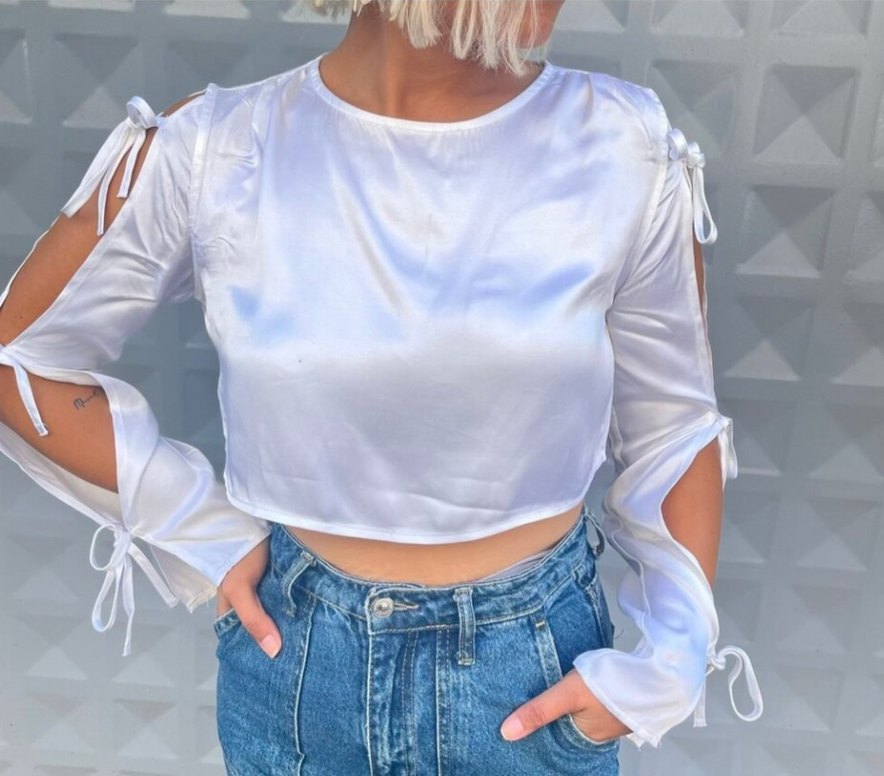 Düğmeli, beyaz uzun kollu, yuvarlak yakalı ve denim kumaştan rahat kesim bir bluz. Günlük sokak stili için uygundur. yeni etiketlidir.