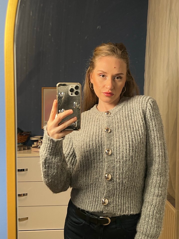 Gri renkli, düğmeli, uzun kollu ve yuvarlak yakalı rahat kesim triko kazak, midi boyda günlük kullanıma uygun.