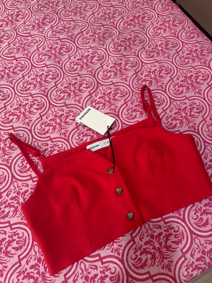 Bershka Düğmeli, ayarlanabilir askılı ve kırmızı bustiyer. Tekne yaka ve renkli nakış detaylarıyla cesur sokak tarzı için uygun. Romantik geceye ideal. ❤️ boyutu göbek deliğinin az üstünde kalıyor boyunu askılardan ayarlayabiliyorsunuz. Orijinaldir, sıfır hiç giyilmedi. Etiketli, ekstra fotoğraf istemeyiniz tüm açılardan çektim, yanında ekstra olarak düğmesi geliyor.