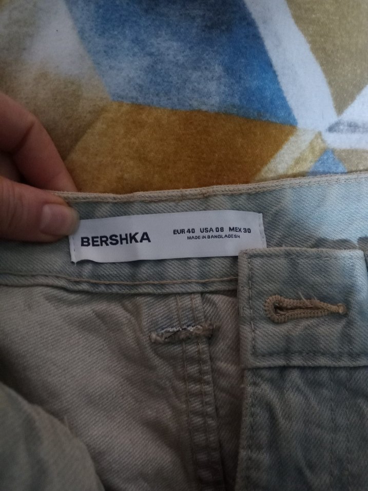 Bershka marka, düğmeli, kısa boy, bol kesim gri denim kadın jean. Baskılı deseniyle günlük sokak stiline uygun rahat bir parça.
