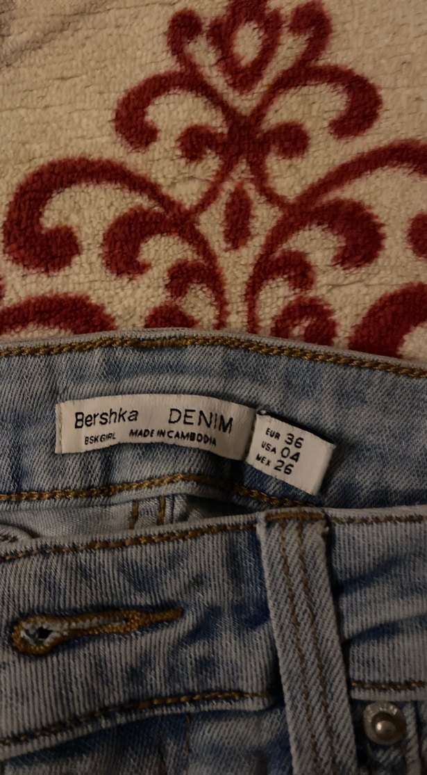 Bershka marka, düğmeli, baskılı desenli, normal boy, mavi renkli, dar kesim kadın denim pantolon.