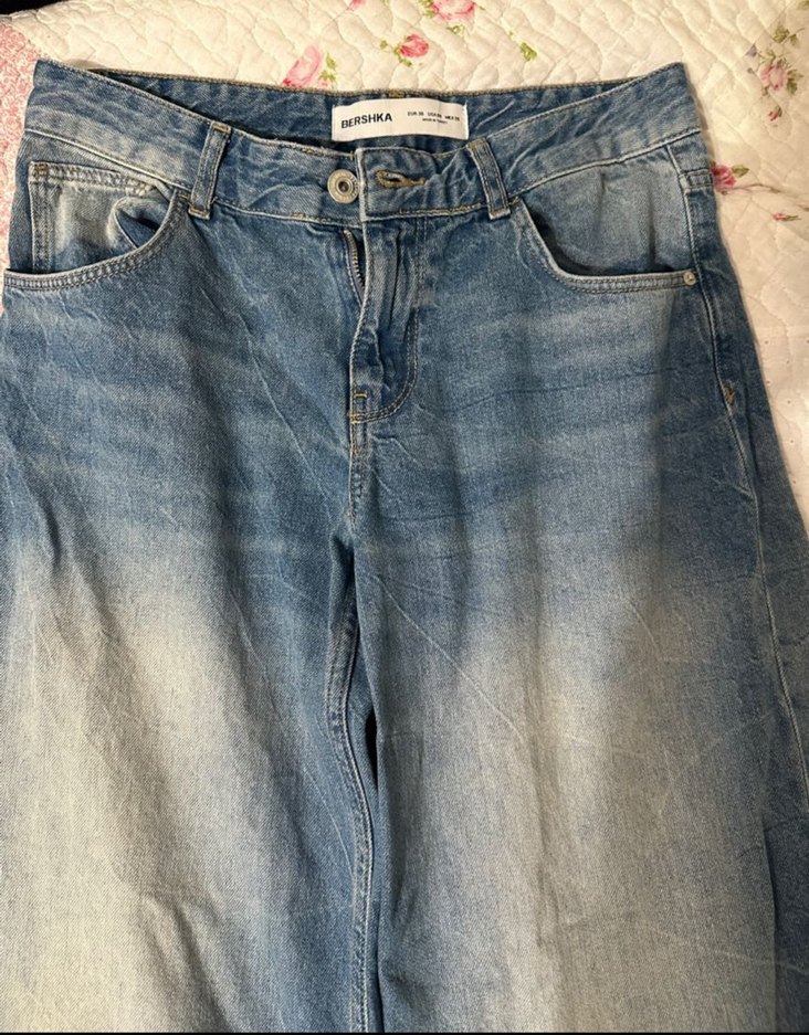 Bershka markasına ait, düğmeli ve rahat kesim mavi jean pantolon. Midi boyda ve günlük rahat stil için uygundur.