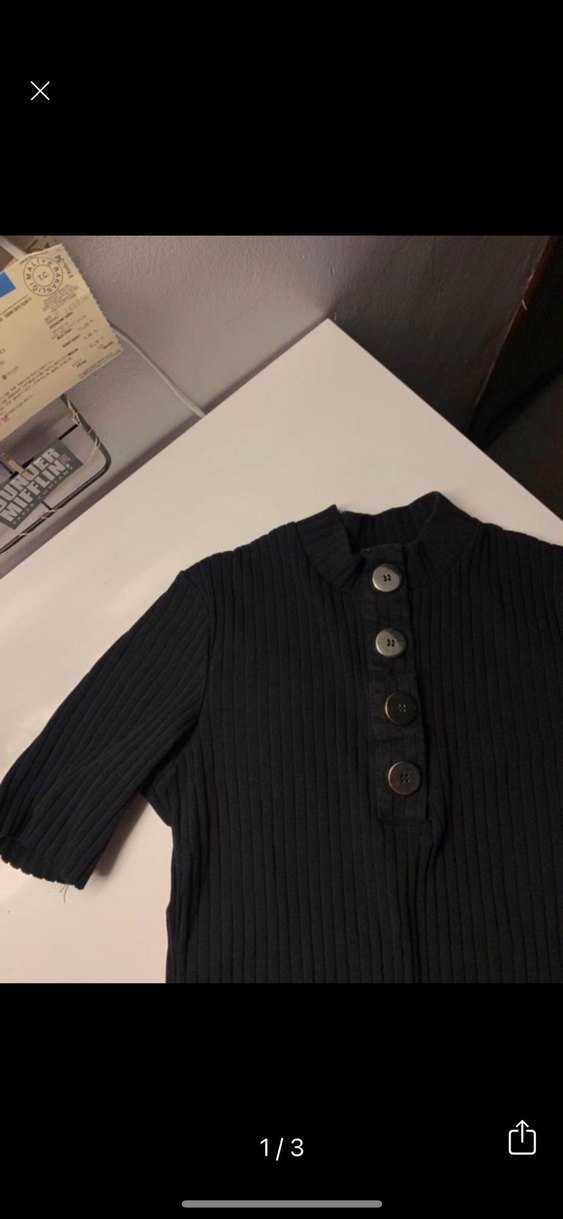 Yenidir kusuru yoktur. Düğmeli, yüksek yakalı, kısa kollu siyah triko, vücuda oturan kesime sahip. Minimalist tarzda günlük kullanıma uygun.