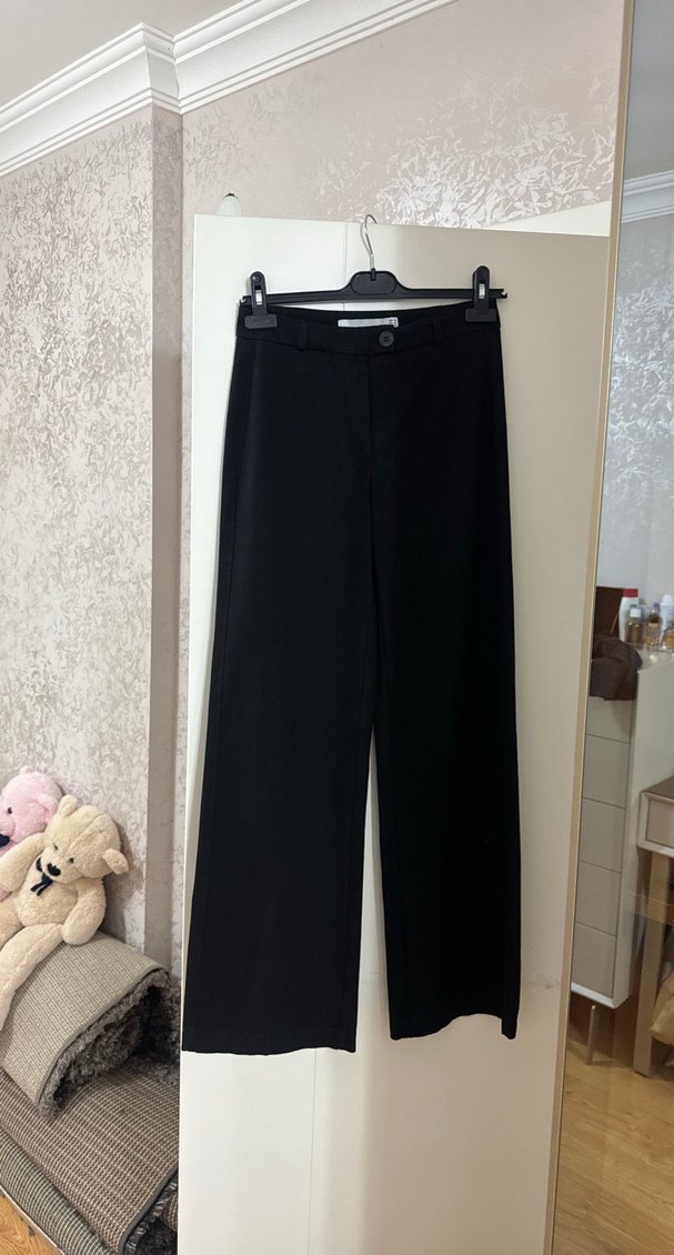 Düğmeli, baskılı siyah kadın pantolon, sentetik kumaştan, midi boyda, ofis ve sokak stili için uygun, dar kesim. 36 beden. Xs/s bedene uyumlu