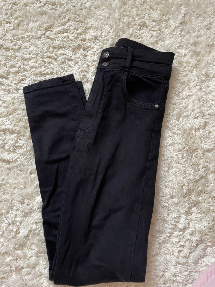 Düğmeli detaylara sahip, normal boyda, siyah kot pantolon. Günlük kullanıma uygun, rahat ve trend bir tarz sunar.