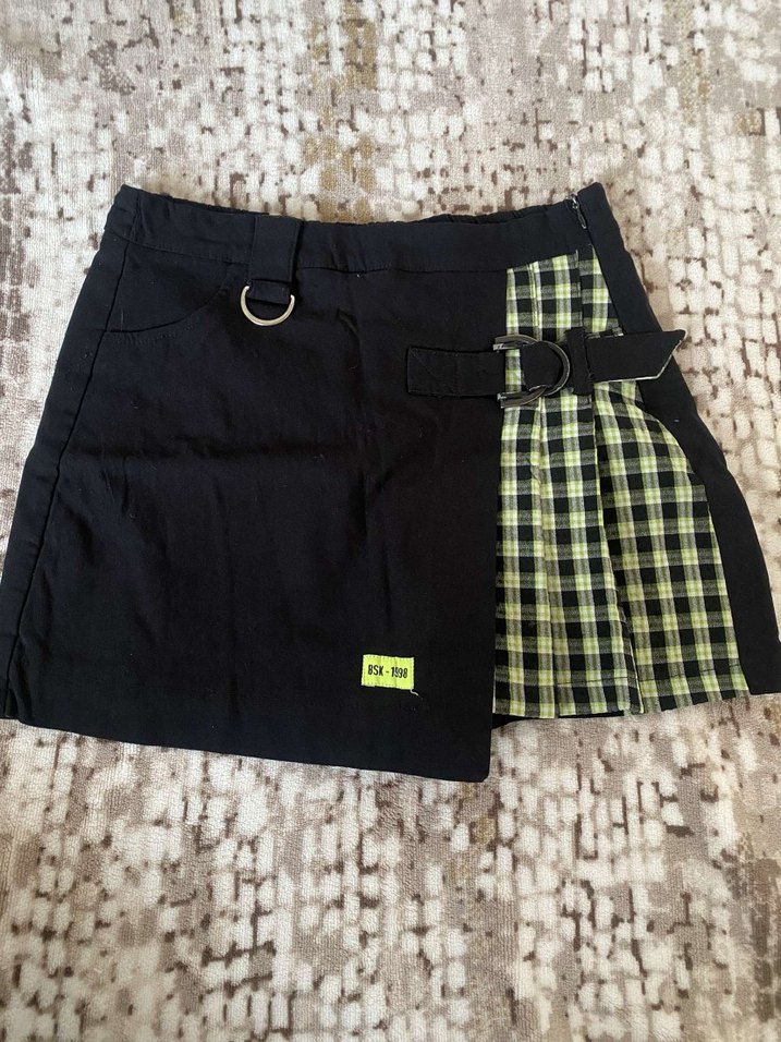 Siyah pilili mini etek, yeşil ekose detaylı, bol kesim ve kemer aksanlı. Sentetik kumaştan, günlük kullanım için uygun.