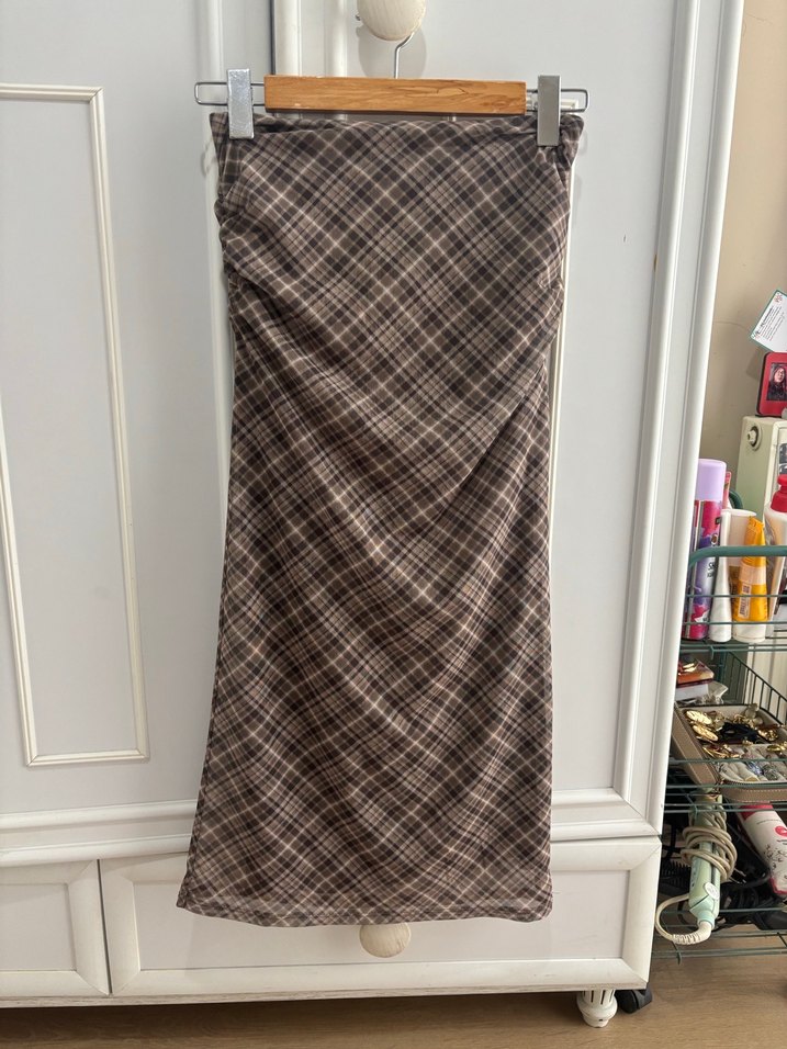 Bej ve gri ekoseli, drapeli, sentetik kumaştan yapılmış, dar kesim uzun etek. Rahat, bohem ve retro sokak modasına uygun, günlük kullanıma uygundur.