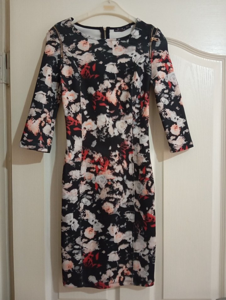 Çiçek desenli, dar kesim elbise sentetik kumaştan yapılmıştır. Fermuarlı detayıyla romantik akşamlar için uygundur. 1 kez giyildi sorunsuz