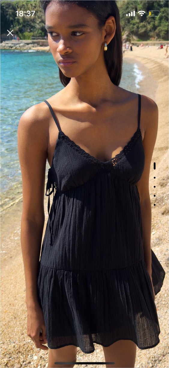 Siyah, askılı ve drapeli tasarıma sahip elbise. Bol kesimli, bohem tarzda, hafif ve yumuşak kumaştan yapılmıştır.