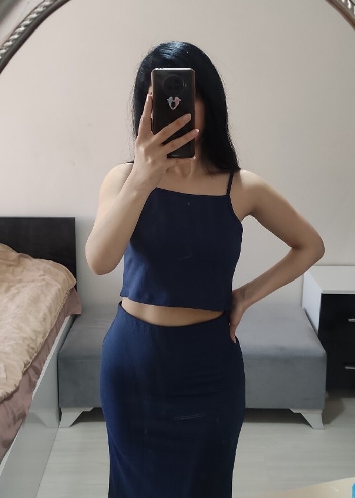 Alt üst takım elbise. Hiç kullanılmadı. L beden bana büyük geldiği için kullanamadım malesef. Normalde m beden giyiyorum belden bol oldu. Markası şimal. Sol tarafta diz altına kadar yırtmacı vardır.