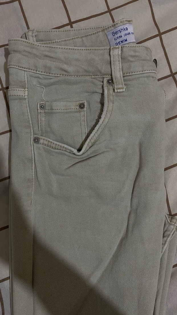 Bej renkte, düğmeli detaylı erkek denim pantolon. Regular fit ve normal midi boyunda, yırtık modeldir.
