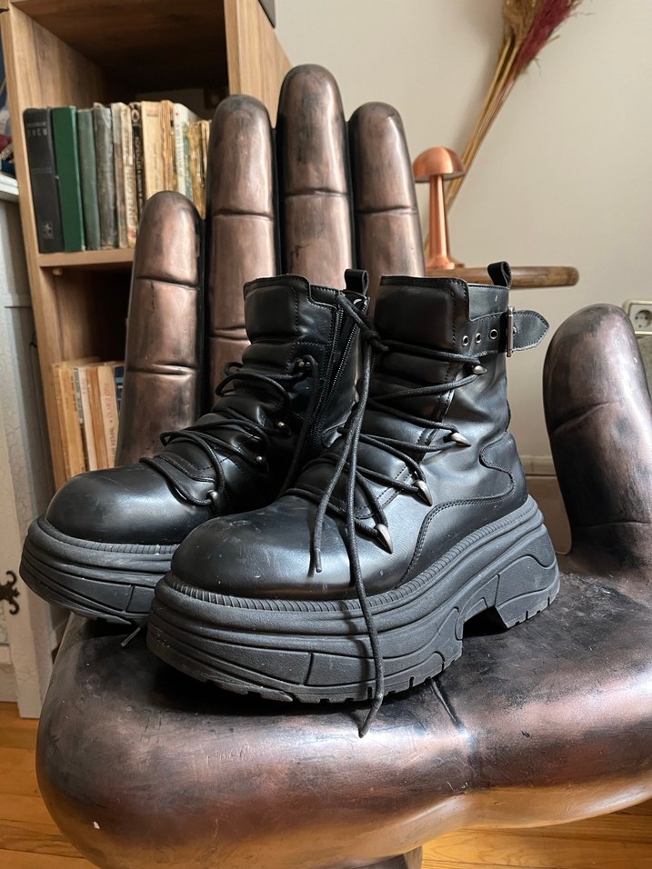 Siyah deri, tokalı ve bağcıklı platform tabanlı goth erkek botları, rock punk tarzı için uygun. Günlük kullanım için ideal. Çok sağlam birkaç kez giyildi