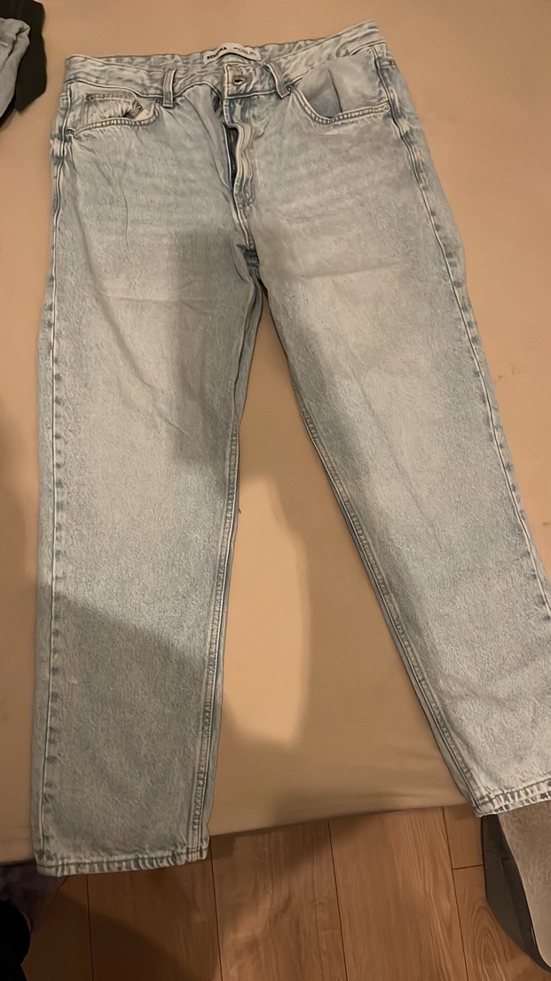 Denim kumaştan, midi boy ve bol kesim gri bej renkte kadın kot. Rahat ve şık, günlük kullanıma uygun.