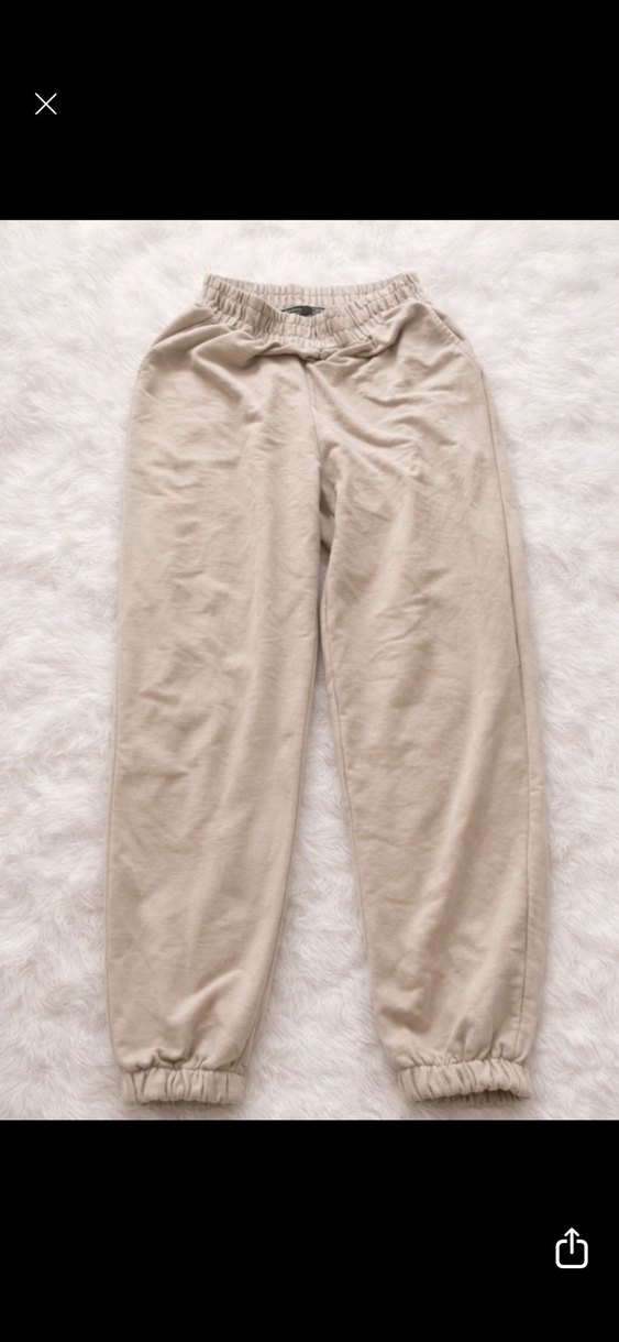 Yumuşak keten kumaştan yapılmış, bej renkli, rahat kesim kadın eşofman. Lastikli bel ve bilek detaylarıyla konforlu ve zahmetsiz şıklık sunar. Günlük kullanım için uygundur.