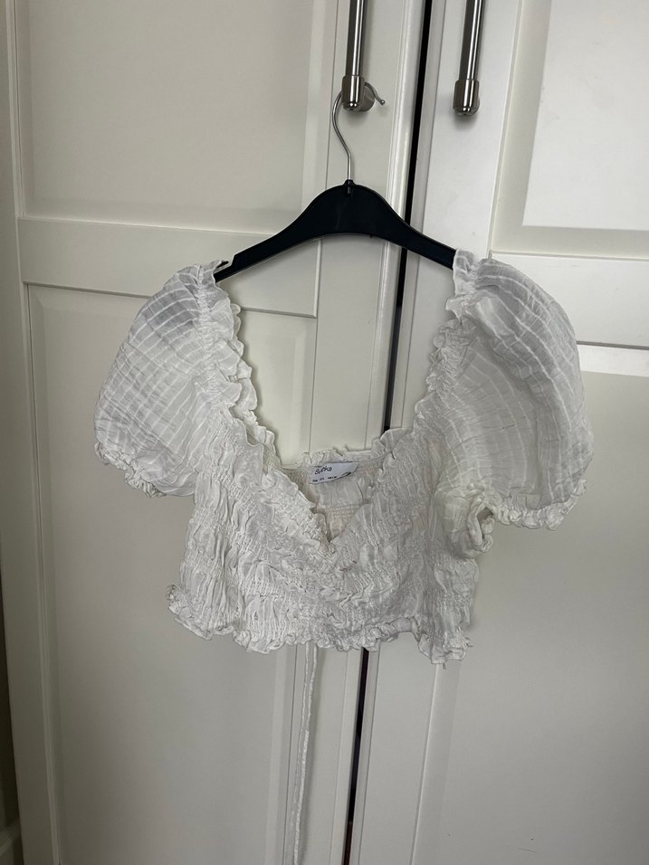 Bershka Fırfırlı Beyaz Crop Bluz