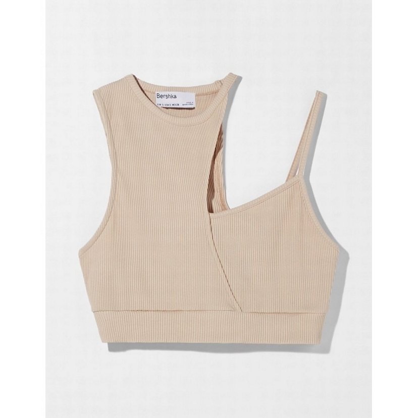 Bej renkte, fitilli asimetrik kesime sahip, bir tarafı askısız diğer tarafı ince askılı crop top.