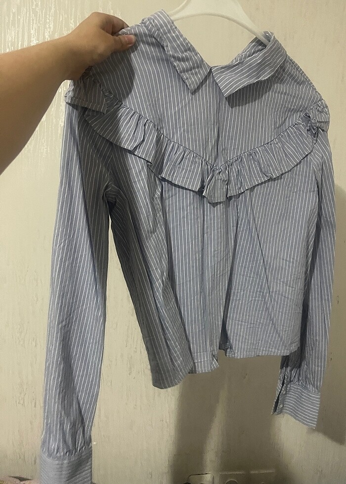 Düğmeli kısmı sırta geliyor fırfırlı çok tatlış bi gömlek dilerseniz düğmeli kısmı önde de kullanabiliyorsunuz