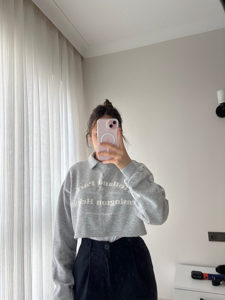 Gri renkli, baskılı, uzun kollu, bol kesim kadın sweatshirt. Yumuşak ve rahat fleece kumaştan, midi boyda ve bisiklet yakalıdır. Günlük kullanıma uygun, trend sokak stili için ideal.