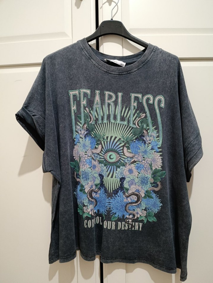 Bershka Gri Baskılı Tişört, kısa kollu ve bisiklet yaka, bol kesim kadın tişört. "FEARLESS" yazılı, çiçek ve yılan baskılı tasarıma sahip. Günlük kullanım için uygun. #tshirt #tisort #raf5 #bershka