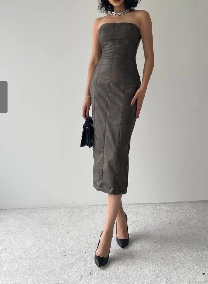Gri yumuşak deri uzun elbise; straplez yakalı, bel detaylı. Çağdaş, Paris tarzı ve ofis kullanımı ve günlük için uygundur.
