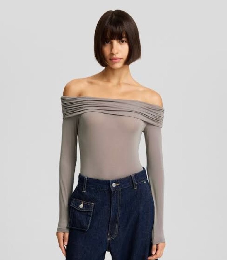 Bershka Gri renkte, drapeli kayık yaka ve uzun kollu, vücuda oturan kadın bluz. Midi boy uzunluğu ve modern tarzıyla günlük kullanıma uygundur.