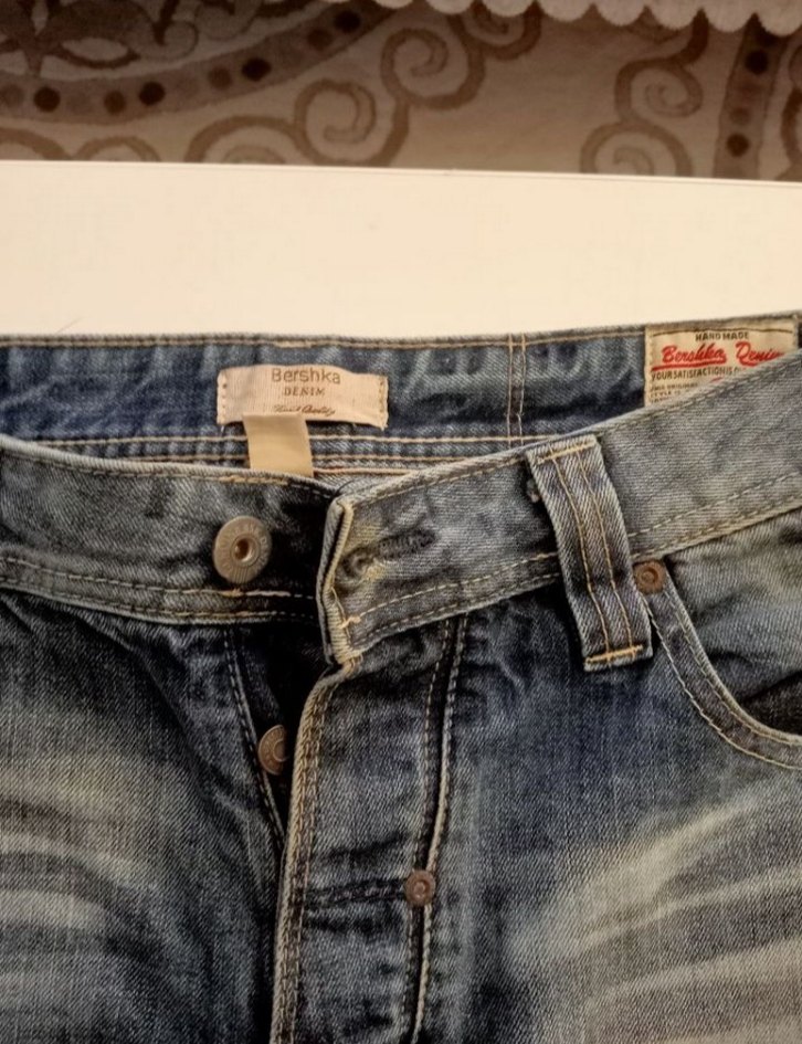 Bershka marka, düğmeli, bol kesim, midi boy, gri-mavi baskılı rahat kesim erkek jean shorth bel 42 boy 50 cm