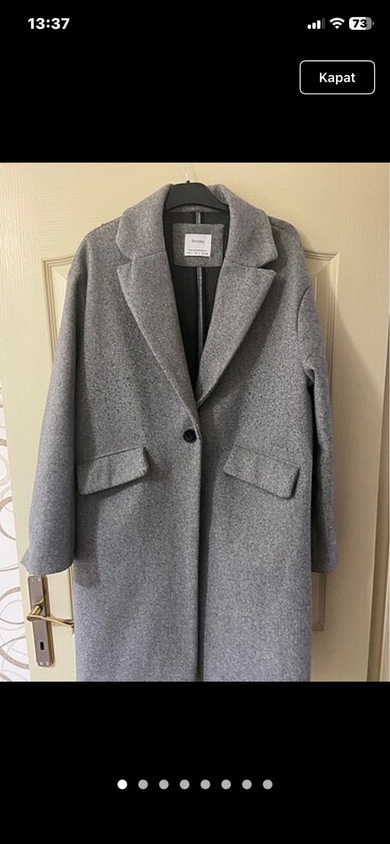 Gri renkte, tek düğmeli, klasik yakalı yün kaban. Önünde iki kapaklı cep bulunur, soğuk havalar için uygundur.
