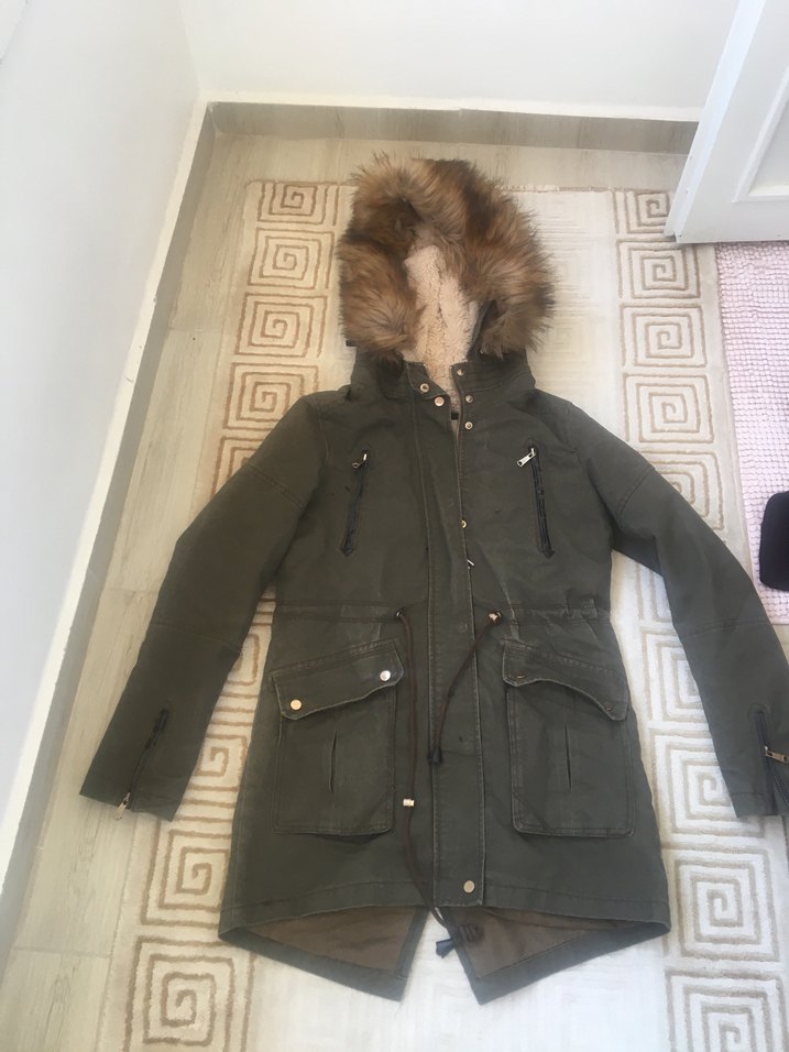 Kürklü kapüşon ve kesimli yaka detayına sahip, koyu gri renkli, ince kesim kadın kışlık mont. Yumuşak ve sıcak kumaştan üretilmiş, çok cepli ve askılı kollu, günlük sokak stiline uygun rahat bir parça. ❄️ deri yerlerinde hafif soyulma var
