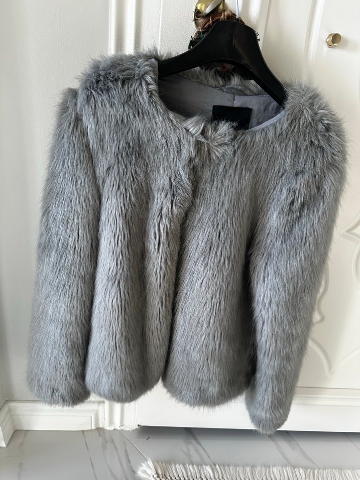Gri renkli, uzun kollu ve yuvarlak yakalı, suni kürkten yapılmış, rahat ve şık midi uzunluğunda kadın ceketi.